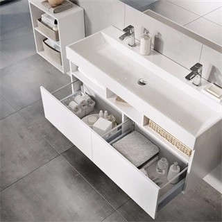 Natural Duo 120 duplamosdó Natural öntött márvány bútor mosdó, falra szerelhető vagy függesztett szekrénybe süllyeszthető, túlfolyó nélkül. Fehér kivitelben.