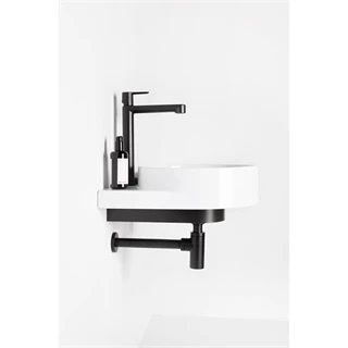 A kör alakú mosdót egy fehér, fekete vagy rozsdamentes acél kivitelű, dizájner elem egészíti ki, rögzítőkonzol formájában. A konzol, a mosdócsaptelep, a szifon és a lefolyó összhangja az elegancia varázsát hozza el fürdőszobájába.
