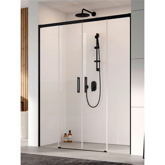 Görgős fekete zuhanyajtó dupla tolóajtóval, oldalt fix részekkel.